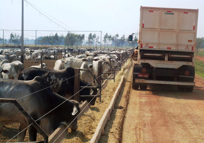 As plantações de sorgo, soja e milho são colhidas na região e armazenadas em silos para a produção da ração que será oferecida aos animais nos piquetes.